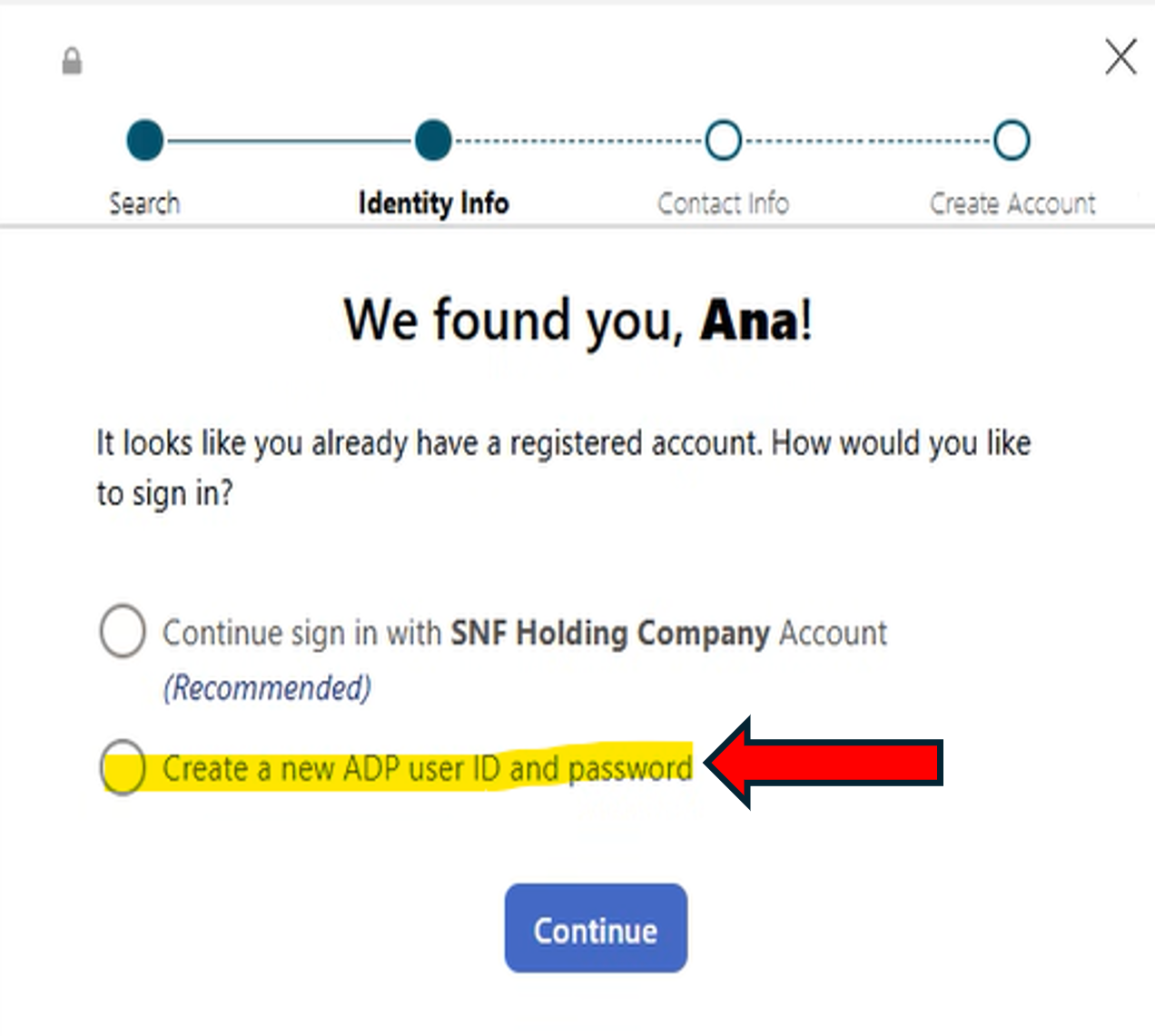5. Select Create a new ADP user ID and password and click Continue.