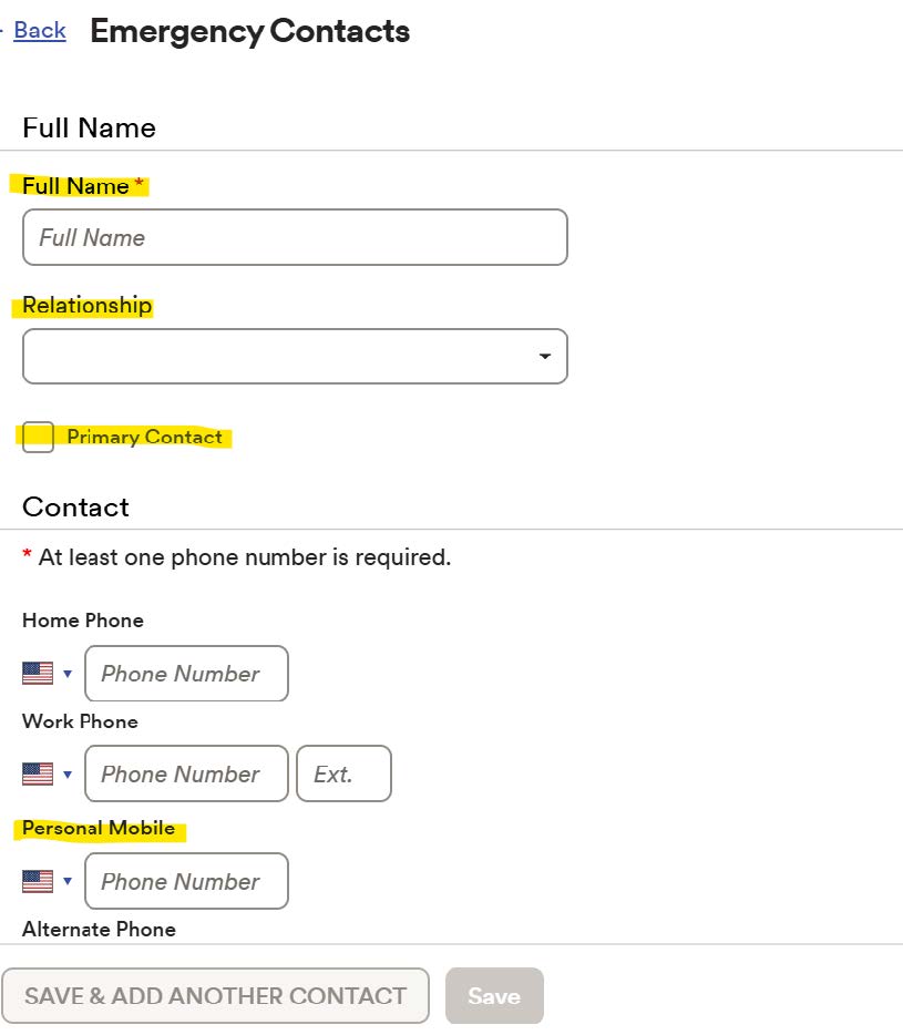 3. Enter the full name, relationship, primary contact designation, and personal mobile number.