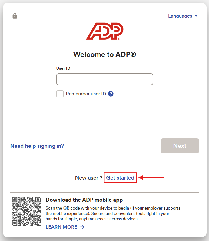 1. Select New User? / Get Started. You must register as a new user even if you have an ADP account with a previous employer.