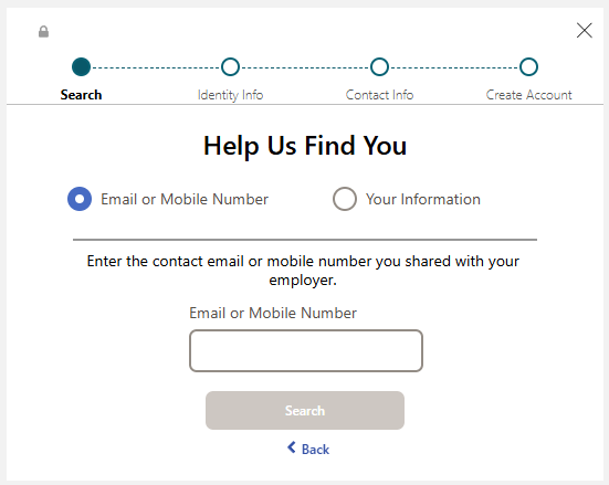 3. Enter your personal email address or mobile number that you have previously provided to SNF and click Search.