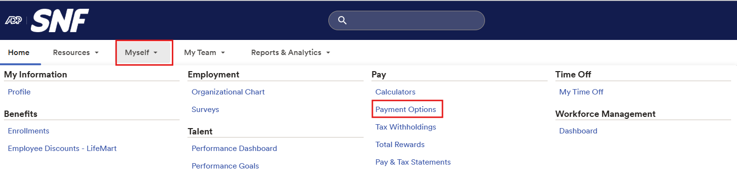 1. Within ADP, go to Myself in the navigation menu and select Payment Options.